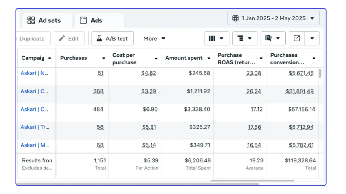 Following a significant inventory investment, this brand was poised for growth but held back by an unstructured account and unclear strategy. From the start, we streamlined their campaigns to deliver instant results, while developing fresh creative, compelling copy, and a long-term media buying framework built for sustainable scaling.